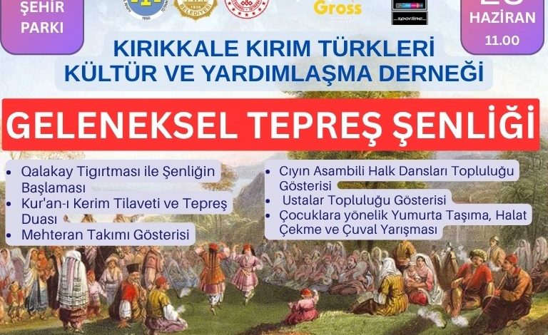 Kırıkkale Kırım Türkleri Kültür ve Yardımlaşma Derneği ile Kırıkkale Belediyesi’nin ortaklaşa düzenlediği Geleneksel Tepreş Şenliği, 28 Haziran Cumartesi günü gerçekleştirilecek.